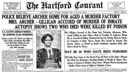 What follows is an historical article that appeared in The Hartford Courant in 1916 about the arsenic murders carried out by Mrs. Archer-Gilligan. This story is the basis for the 1944 Hollywood film “Arsenic and Old Lace” starring Cary Grant and Priscilla Lane and directed by Frank Capra. The movie is based on the play by Joseph Kesseling of the same that appeared in 1939.