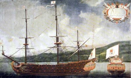 After launching in 1688 the ship was transferred to Santoña and completed. In May 1690 the masts were set in place. The ship’s painting by Martin Amigo is from that year (see Fig. 3). It is an oil painting on canvas 210 * 135 cm. Today that painting is in the parish church „Iglesia de la Asunción“ in Arcenillas, Zamora.