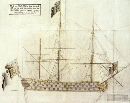 The first illustration of the „Real Felipe“ was made in the second half of the 18th century by José Manuel de Moraleda y Montero. The artist was born only in 1750, the year when the ship was broken up.