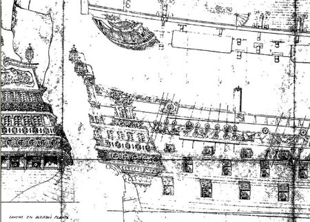 In 1687 José Antonio de Gaztañeta (1656 – 1728) visited the shipyard to catch up on the work at the new flagship. As admiral of the Spanish Armada Gaztañeta did influence the Spanish ship building markedly, till the 18th century. His book „Arte de Fabrica Reales” of 1691 [1] contains detailed drawings of the „Nuestra Señora de la Concepción y de las Ánimas“. There is a view of the stern, a side view and a detail drawing of the stern gallery (see Fig. 1 and 2). The ship is shown as small three-decker without elevated forecastle, carrying 90 to 94 guns.