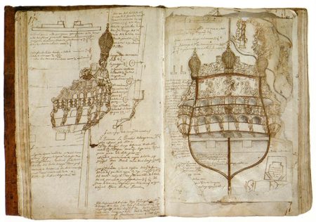 Fig. 5 shows part of this drawing. There are marked discrepancies to the drawing by Vincenzo Lusci and the Mantua model kit drawings. The taff-rails at the stern are more elaborately decorated and the ornamentation of the stern is different. Instead of the round ornaments below the galleries there is a deck with round windows. It is not known who exactly made this drawing.